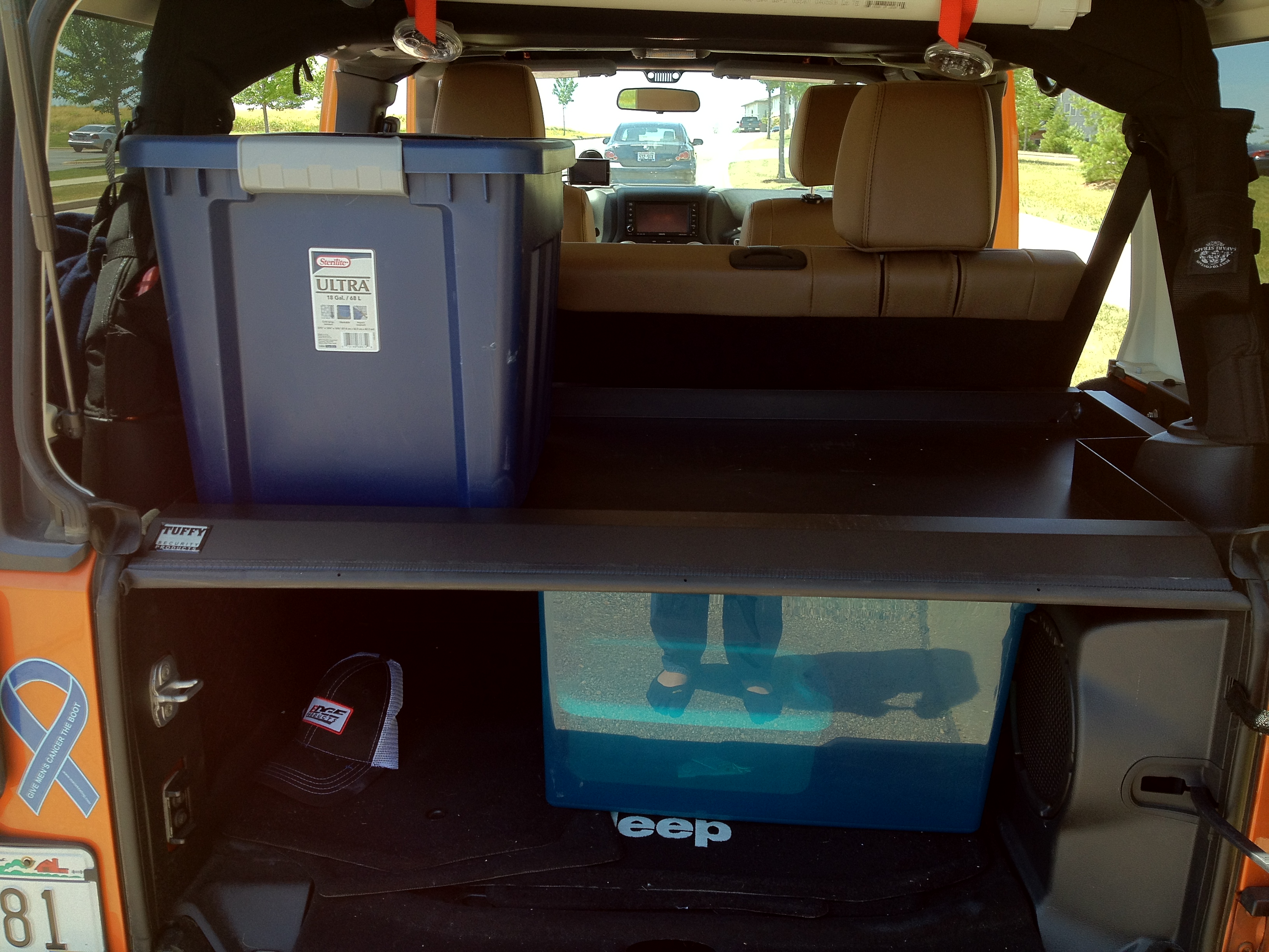 With the back plate installed, you still have a few inches of space behind the rear seats (in the Unlimited, anyway). See the second picture with the hat for size reference. It’s enough for emergency blankets or maybe even an off-road jack.